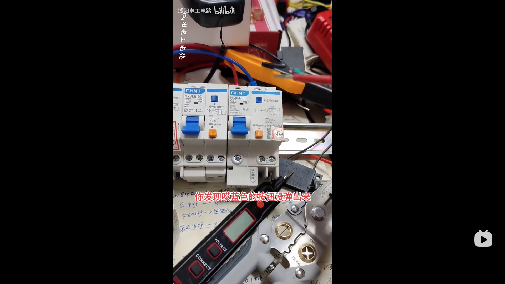 漏电情况下,蓝色按钮会弹出来(忽略字幕)。